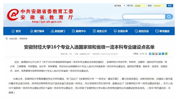 1月2日,安徽教育网报道了我校16个专业入选国家级和省级一流本科专业建设点名单,具体报道链接如下: