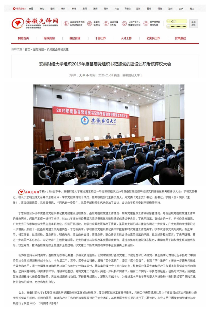 1月10日,安徽先锋网、安徽教育网、中安教育网报道了我校召开2019年度基层党组织书记抓党的建设述职考核评议大会,具体报道链接如下: