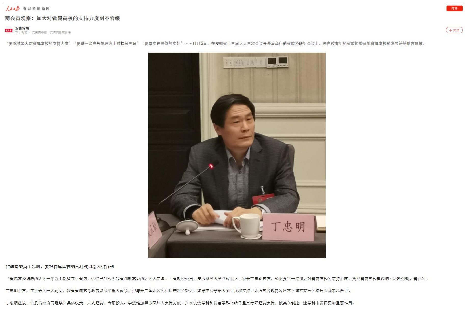 1月13日,人民日报、安青网以《省政协委员丁忠明:要把省属高校纳入科教创新大省行列》为题,发布对省政协委员、我校党委书记、校长丁忠明的“两会访谈”。