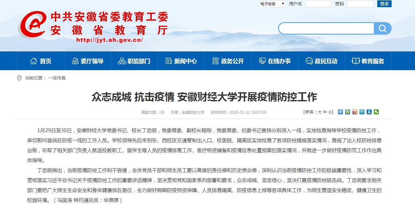 1月31日,安徽教育网、安徽先锋网报道了我校深入一线,深入开展疫情防控工作。具体报道链接如下: