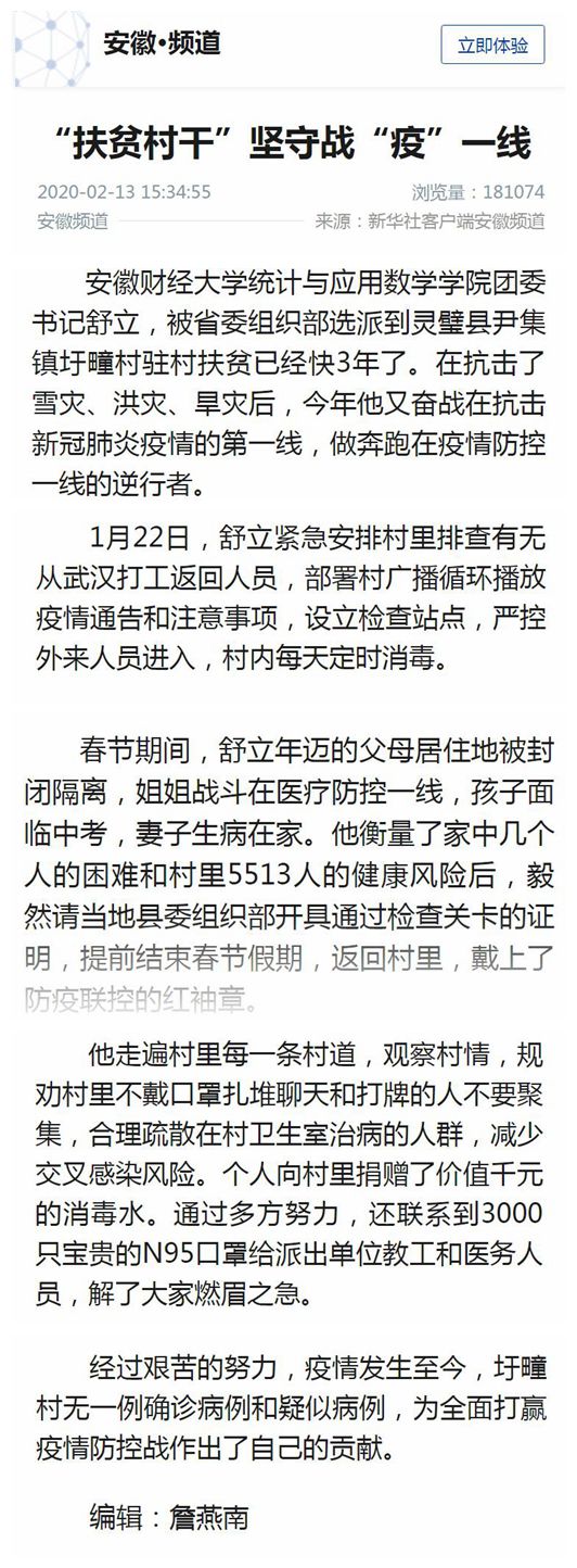 2月13日,新华社安徽频道以《“扶贫村干”坚守战“疫”一线》为题,报道我校教师舒立先进事迹。现将全文转载如下: