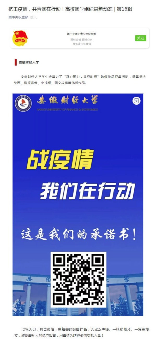 1月22日,共青团中央以《抗击疫情,共青团在行动!高校团学组织最新动态|第16辑》为题,报道我校共青团组织“凝心聚力,共克时艰”防疫作品征集活动。