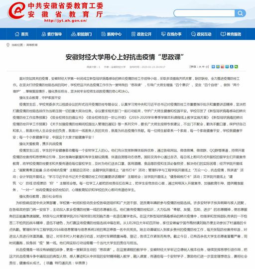 2月23日,安徽教育网报道了我校为学生上好抗击疫情“思政课”,具体报道链接如下: