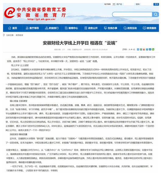 2月26日,安徽教育网报道了我校线上开学日 相遇在“云端”。
