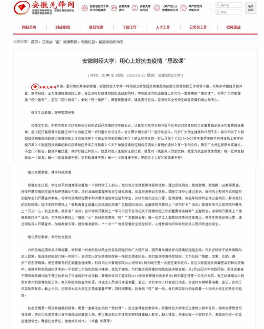 2月27日,安徽先锋网报道了我校疫情期间,用心上好抗击疫情“思政课”。具体报道链接如下: