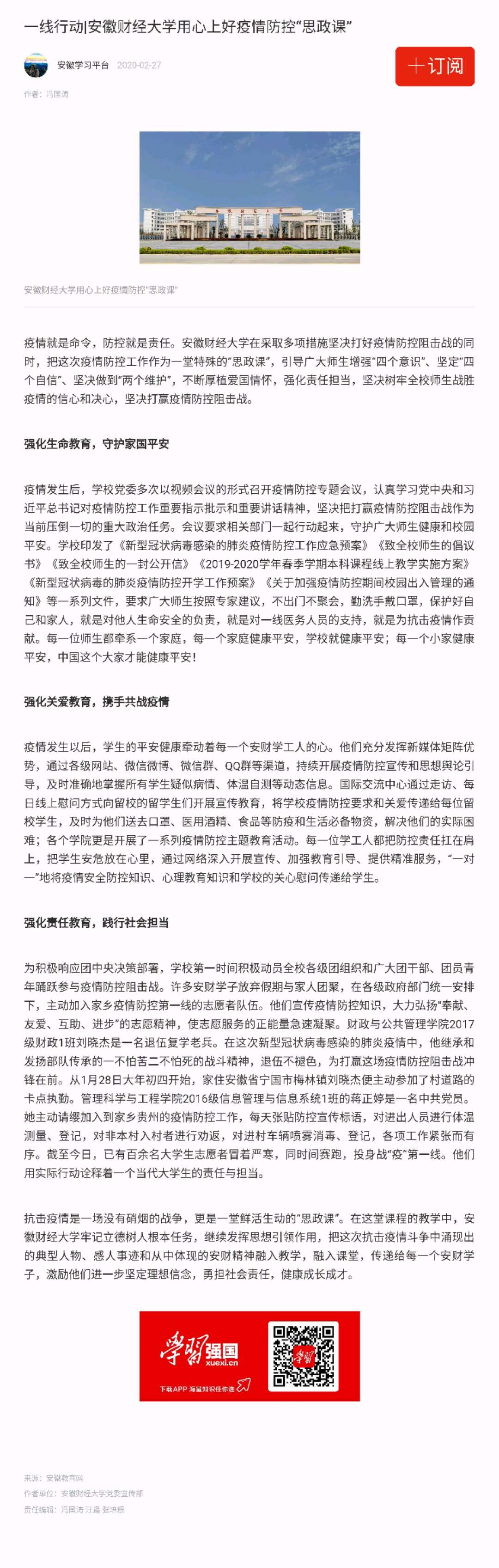 2月27日,学习强国平台报道了我校用心上好疫情防控“思政课”,具体报道链接如下: