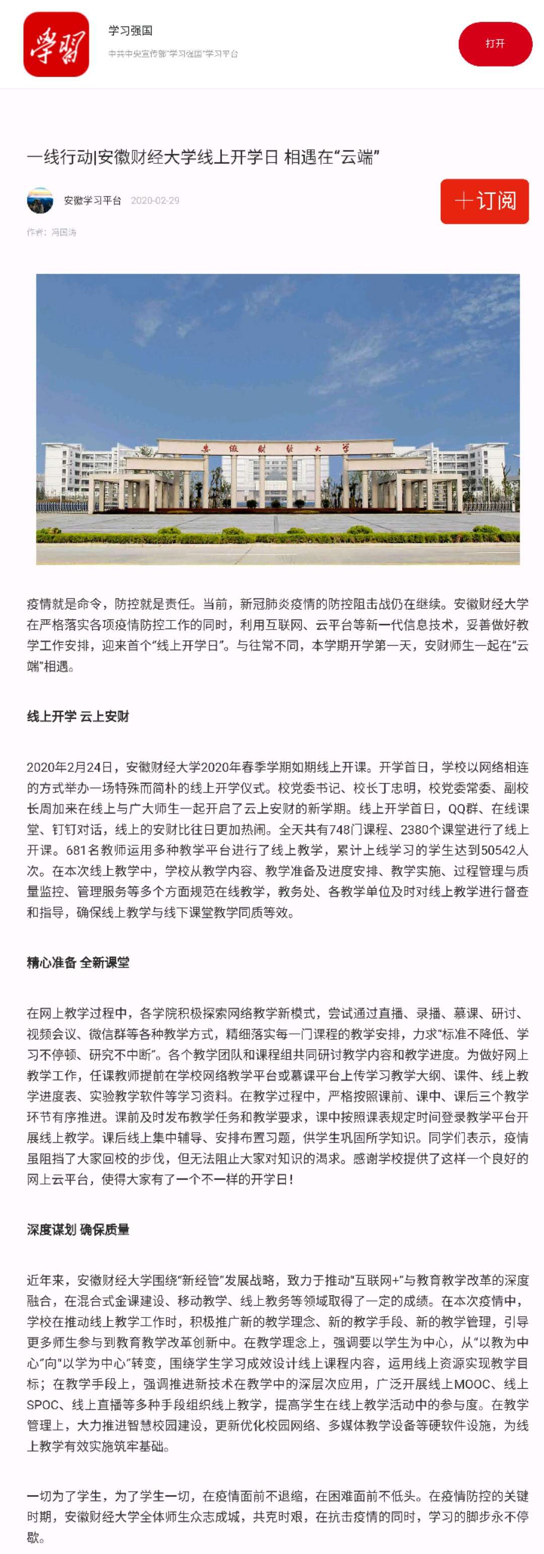 2月29日,学习强国平台报道了我校线上开学日,师生相遇在“云端”,具体报道链接如下: