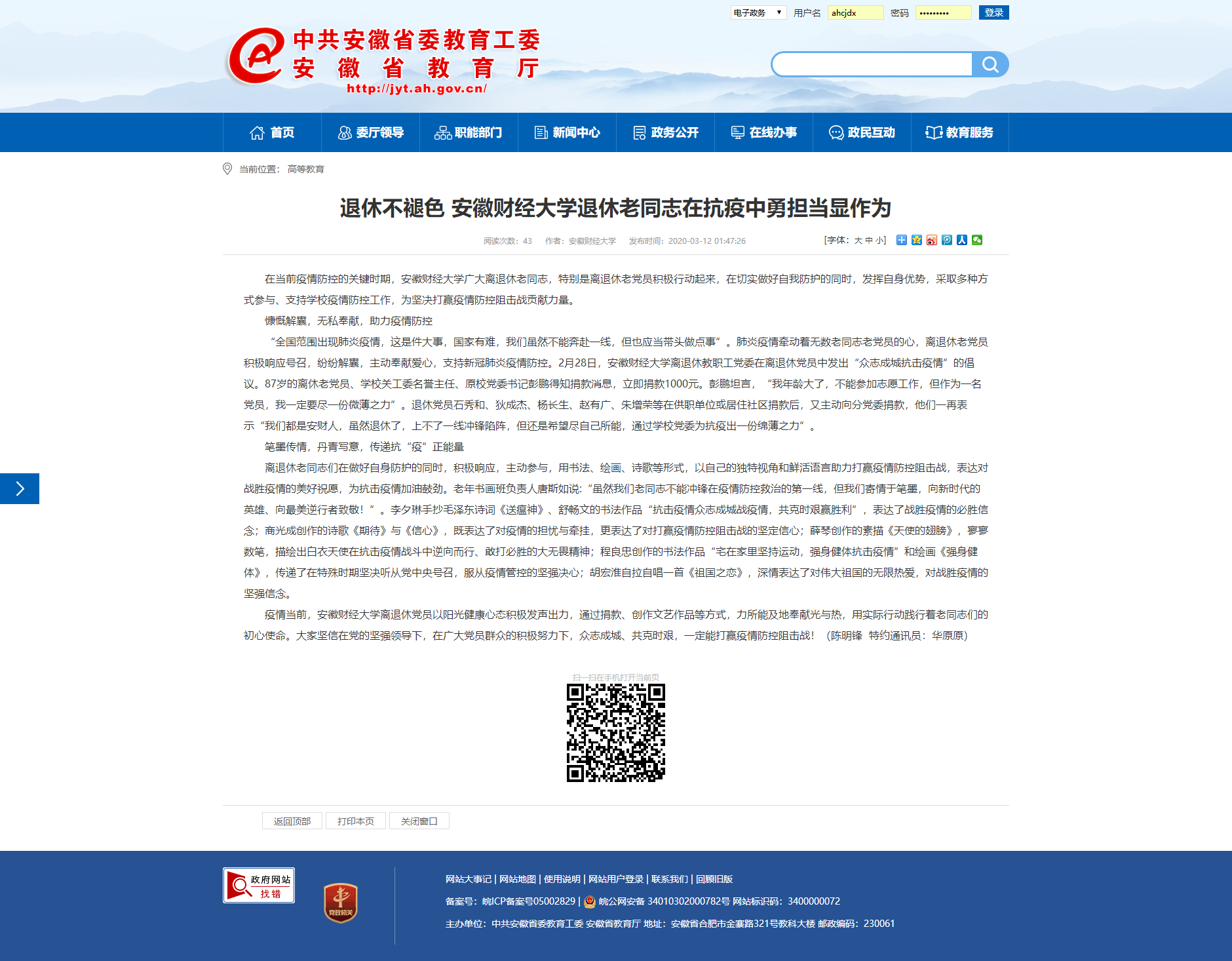 3月12日,安徽教育网、安徽先锋网、中安教育网、安徽网报道了我校退休老同志退休不褪色,在抗疫中勇担当显作为。具体报道链接如下: