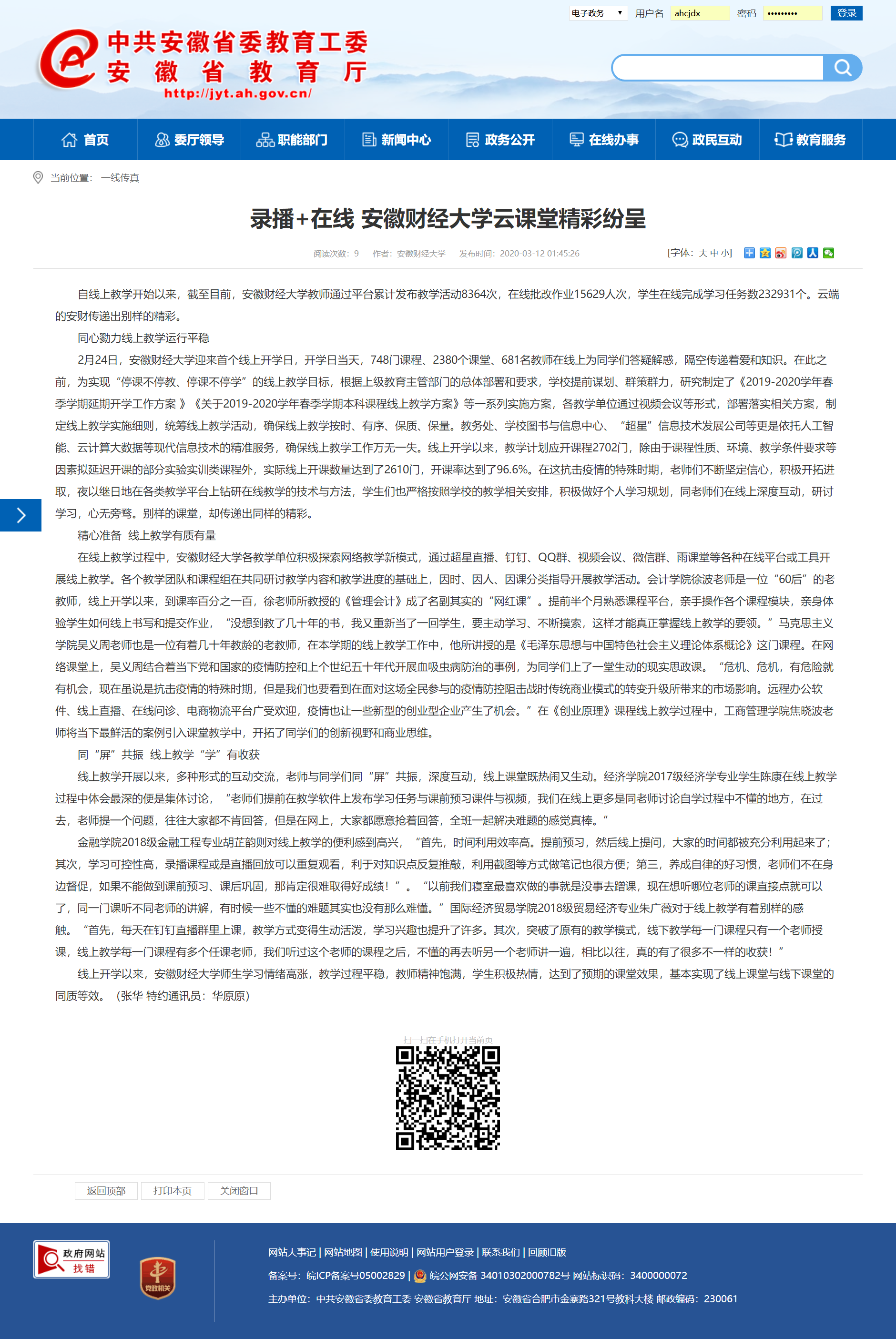 3月9日,安徽教育网、中安教育网报道了我校云课堂“录播+在线”精彩纷呈,具体报道链接如下: