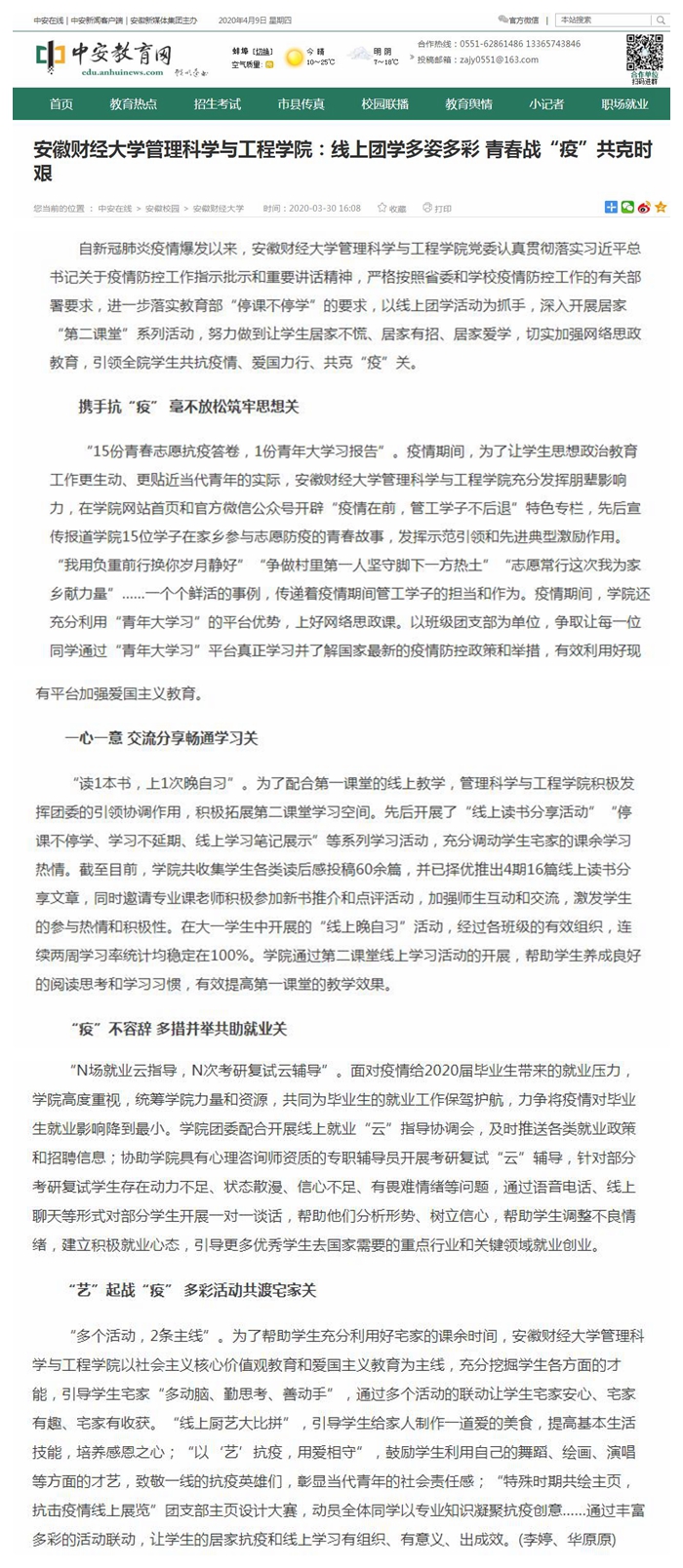 3月30日,中安教育网报道了我校线上团学多姿多彩 青春战“疫”共克时艰。具体报道链接如下: