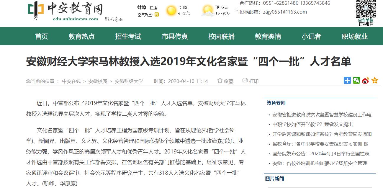 4月10日,中安教育网、安徽网报道了我校宋马林教授入选2019年文化名家暨“四个一批”人才名单,具体报道链接如下: