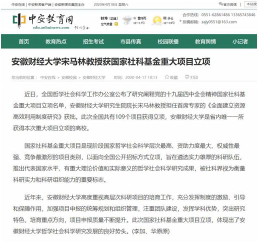 4月17日,中安教育网、安徽网报道了我校宋马林教授获国家社科基金重大项目立项,具体报道链接如下: