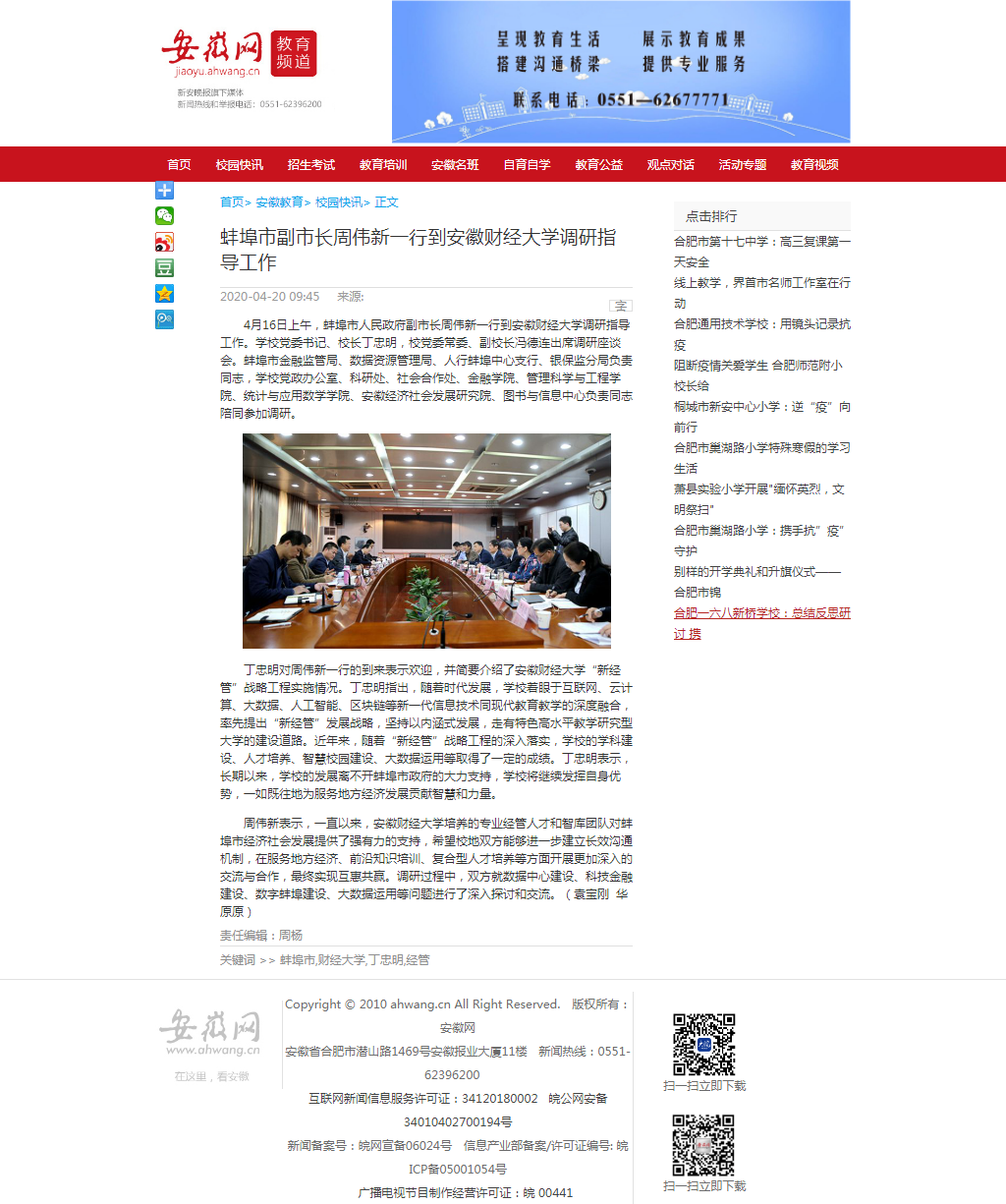 4月16日,安徽网报道了蚌埠市副市长周伟新一行到我校调研指导工作,具体报道链接如下:
