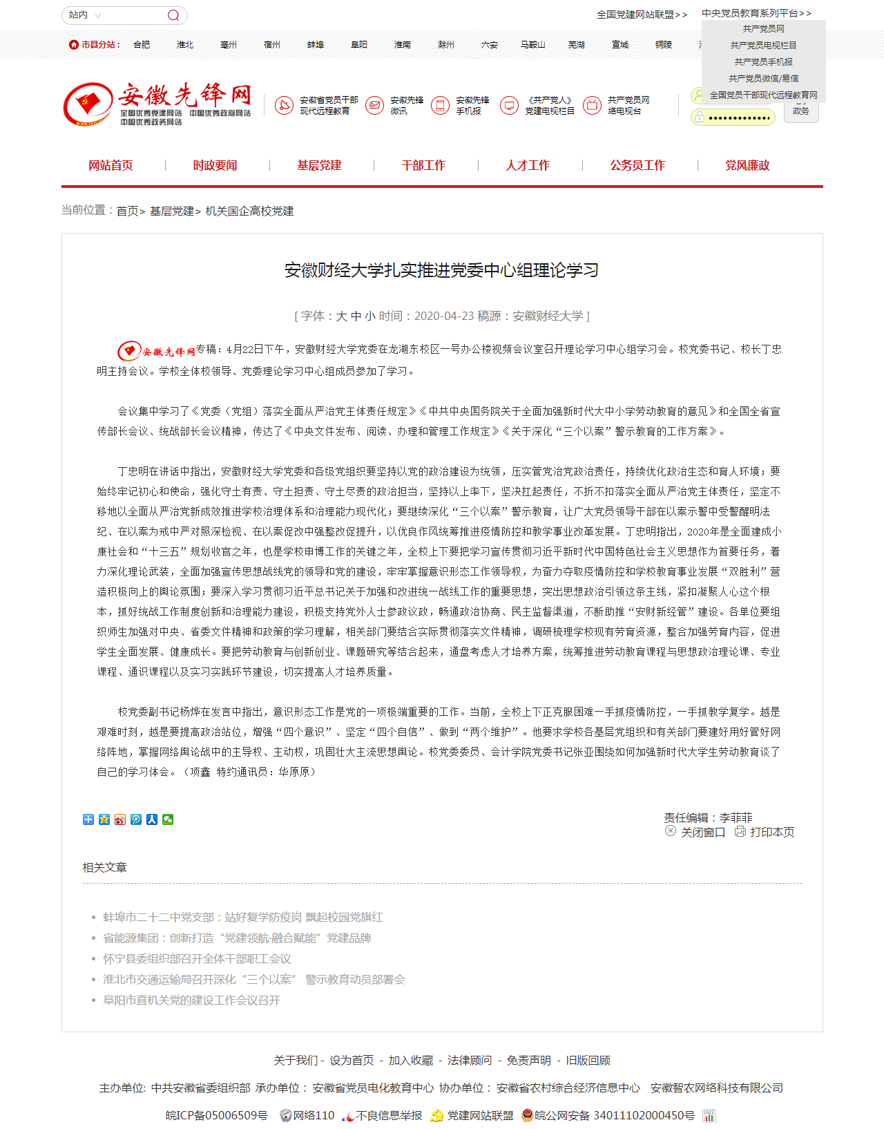 4月23日,安徽先锋网报道了我校扎实推进党委中心组理论学习,具体报道链接如下: