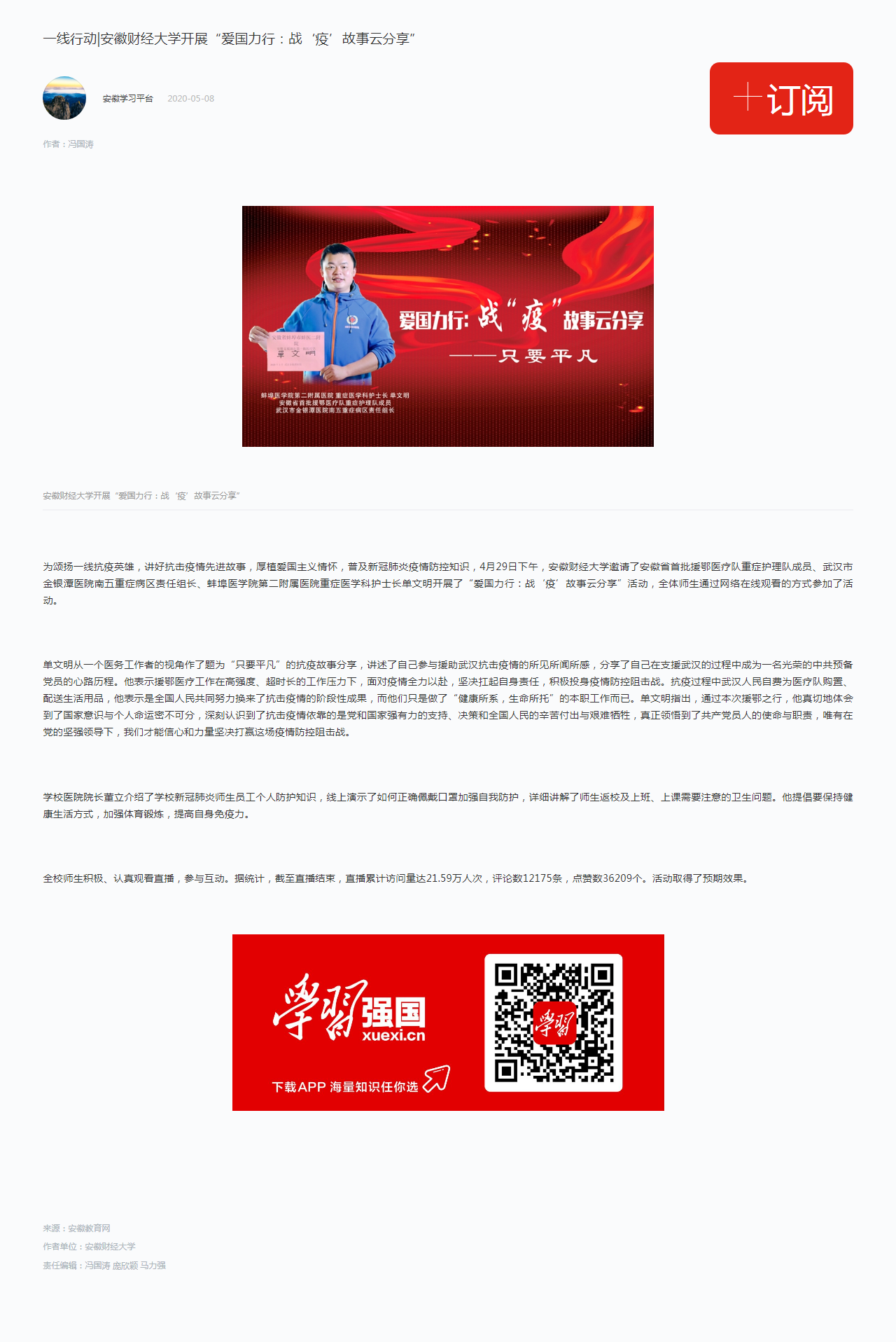 5月8日,学习强国平台报道了我校开展“爱国力行:战‘疫’故事云分享”,具体报道链接如下:https://article.xuexi.cn/articles/index.html?source=share&art_id=17612051529616670561&showmenu=false&study_style_id=feeds_default&t=1588982054845&share_to=wx_single