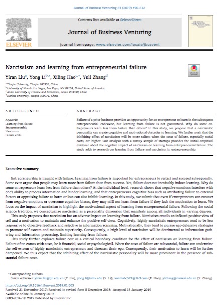 2019年工商管理学院工商管理系副教授郝喜玲博士作为通讯作者与天津大学刘依冉博士、美国内华达大学李涌教授(Yong Li)和南开大学张玉利教授合作完成研究论文,题为Narcissism and learning from entrepreneurial failure,已于SSCI收录刊物Journal of Business Venturing上发表。