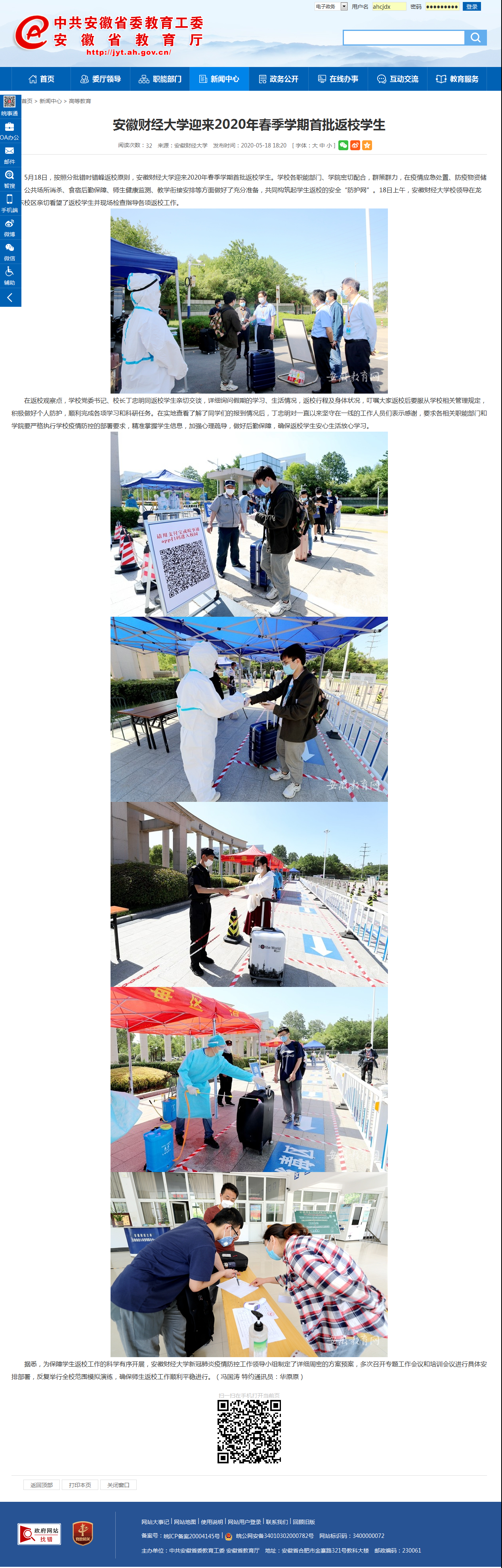 5月18日,安徽教育网、中安教育网、安徽网报道了我校迎来2020年春季学期首批返校学生,具体报道链接如下: