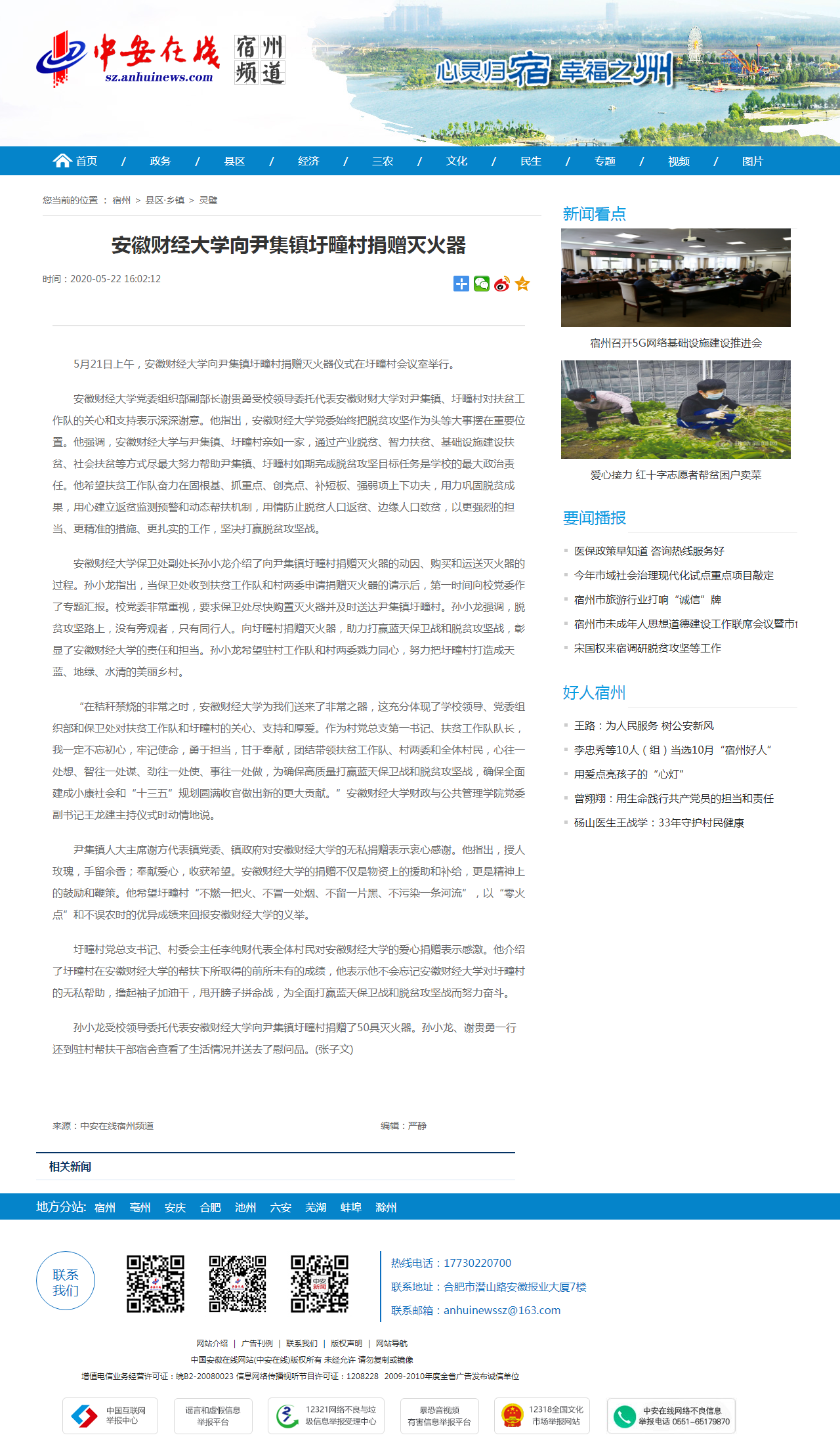 5月22日,中安在线报道了我校向尹集镇圩疃村捐赠灭火器,具体报道链接如下: