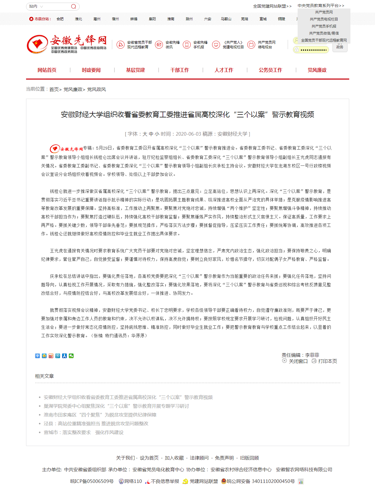 6月3日,安徽先锋网报道我校扎实推进“三个以案”警示教育,组织集中收看省委教育工委推进省属高校深化“三个以案”警示教育视频。具体报道链接如下: