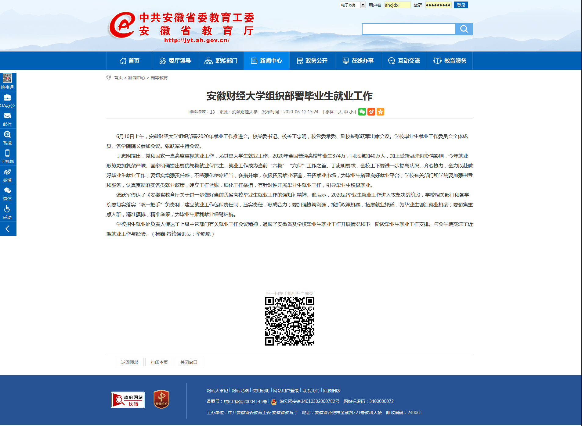 6月12日,安徽教育网报道了我校组织部署毕业生就业工作,具体报道链接如下:http://jyt.ah.gov.cn/xwzx/gdjy/39982188.html
