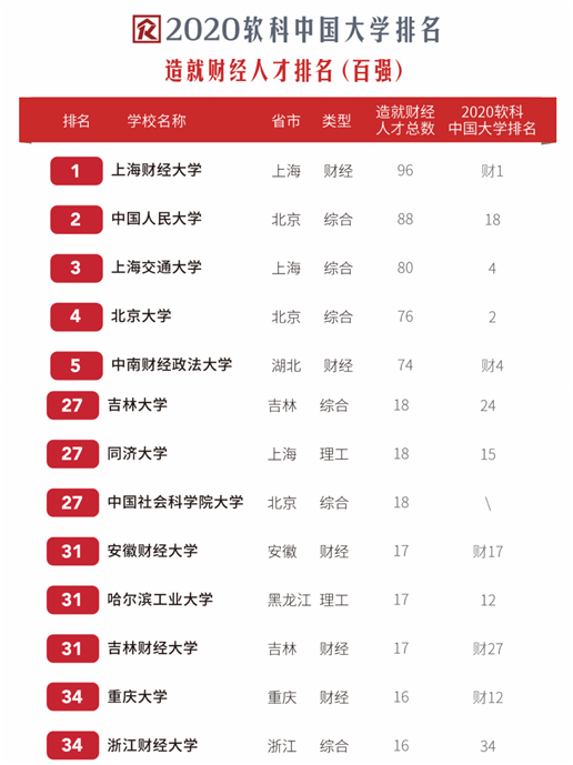 2020软科发布中国大学“造就财经人才”排名,我校财经类人才培养能力位居全国高校第31位、财经类高校第11位。具体报道链接如下:https://mp.weixin.qq.com/s/R5RalUyyI6MXFfGR8Ux2Sg