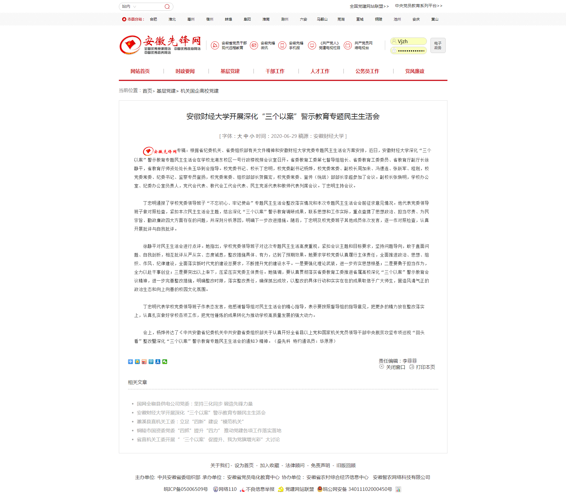 6月29日,安徽先锋网报道了我校开展深化“三个以案”警示教育专题民主生活会,具体报道链接如下:http://www.ahxf.gov.cn/Home/Content/1071069?ClassId=6170