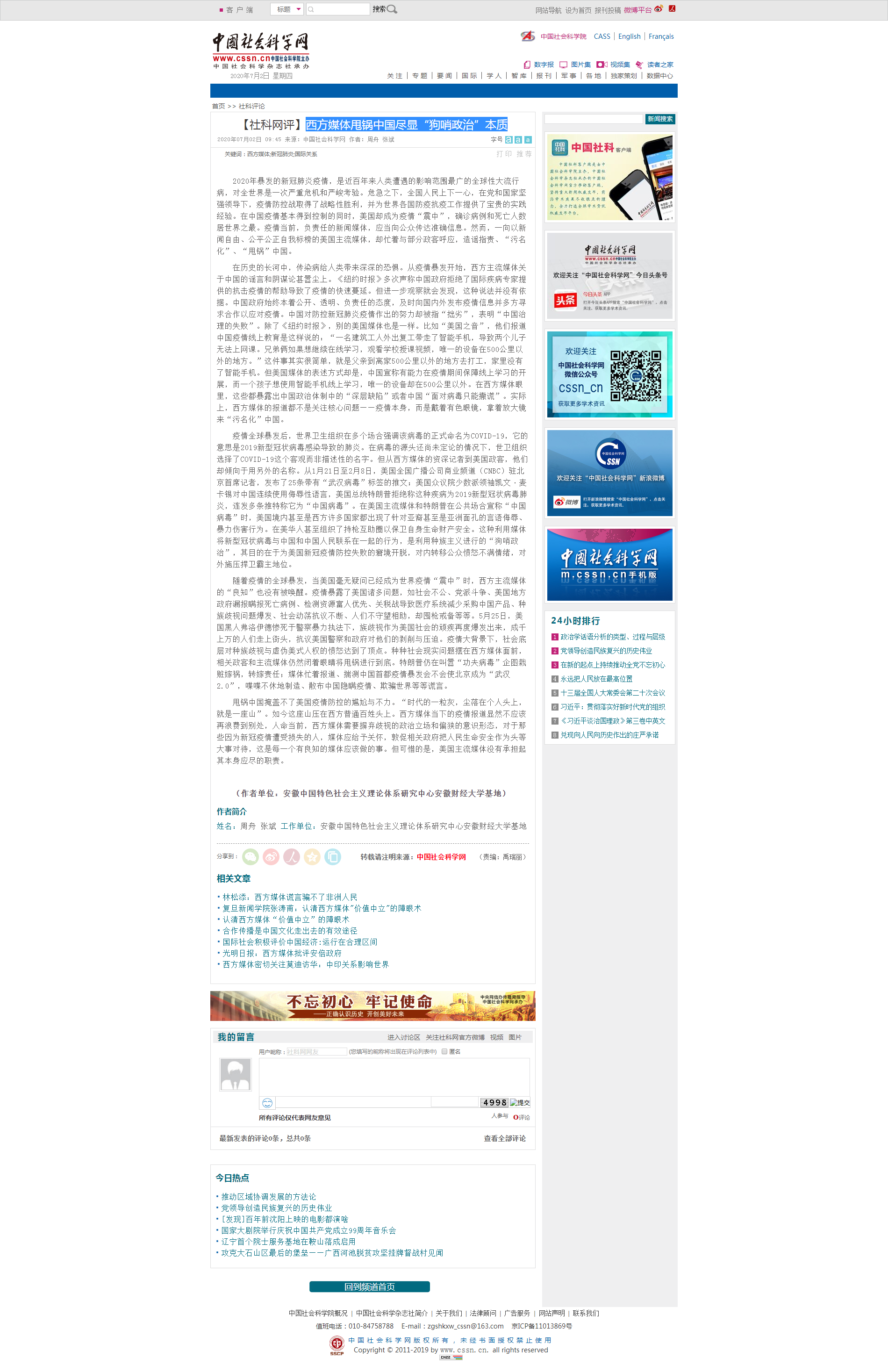 7月2日,中国社会科学网刊发了我校教师周舟、张斌发表社科网评文章:西方媒体甩锅中国尽显“狗哨政治”本质。具体链接如下: