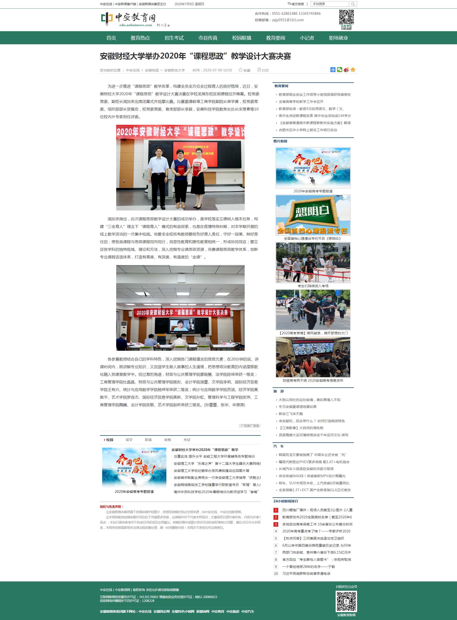 7月9日,中安教育网报道了我校举办2020年“课程思政”教学设计大赛决赛,具体报道链接如下: