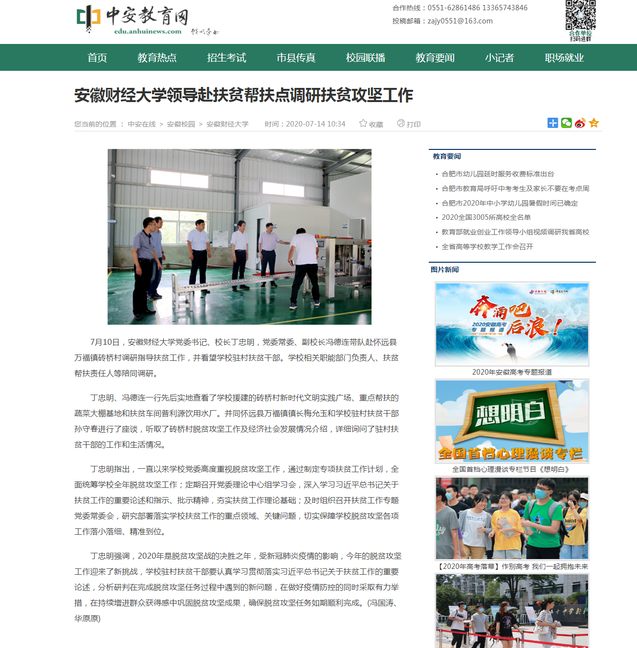 7月14日,中安教育网报道了我校赴扶贫帮扶点调研脱贫攻坚工作,具体报道链接如下: