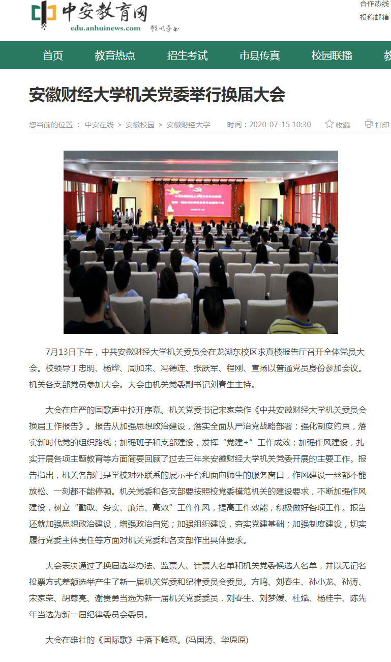 7月15日,中安教育网报道了我校机关党委举行换届大会,具体报道链接如下: