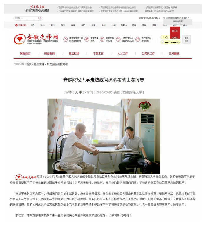 9月5日,安徽先锋网、中安教育网报道了我校领导走访慰问抗战老战士老同志,具体报道链接如下: