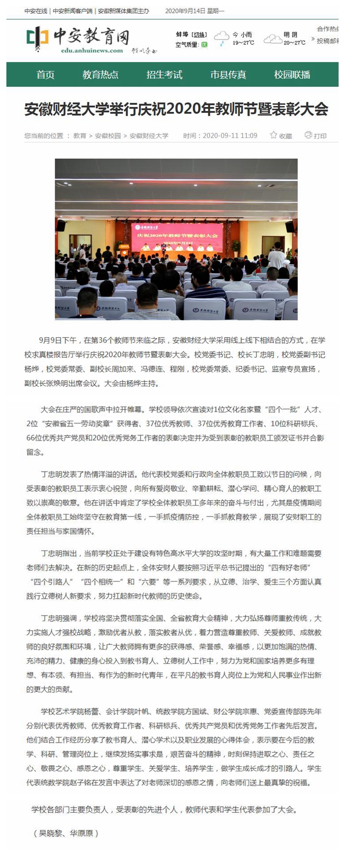 9月11日,中安教育网报了我校举行庆祝2020年教师节暨表彰大会,具体报道链接如下: