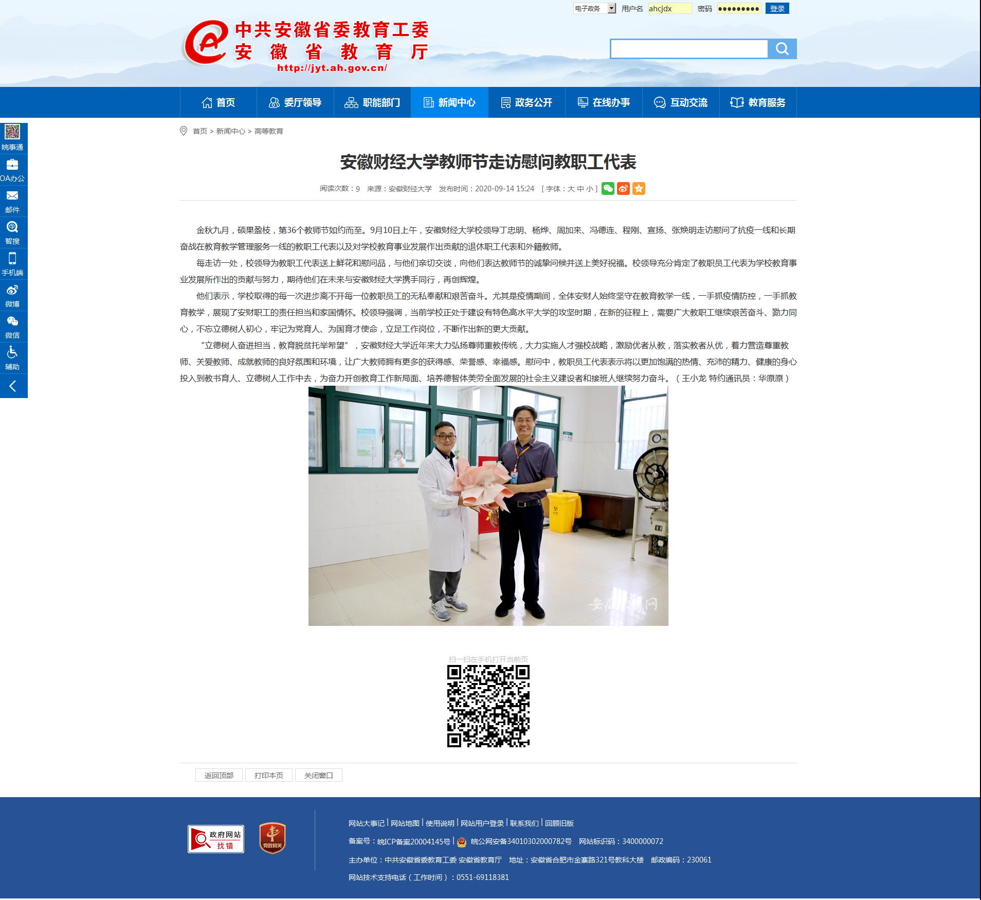 9月14日,安徽教育网、中安教育网报道了学校教师节走访慰问教职工代表,具体报道链接如下:安徽教育网报道链接:http://jyt.ah.gov.cn/xwzx/gdjy/40362141.html