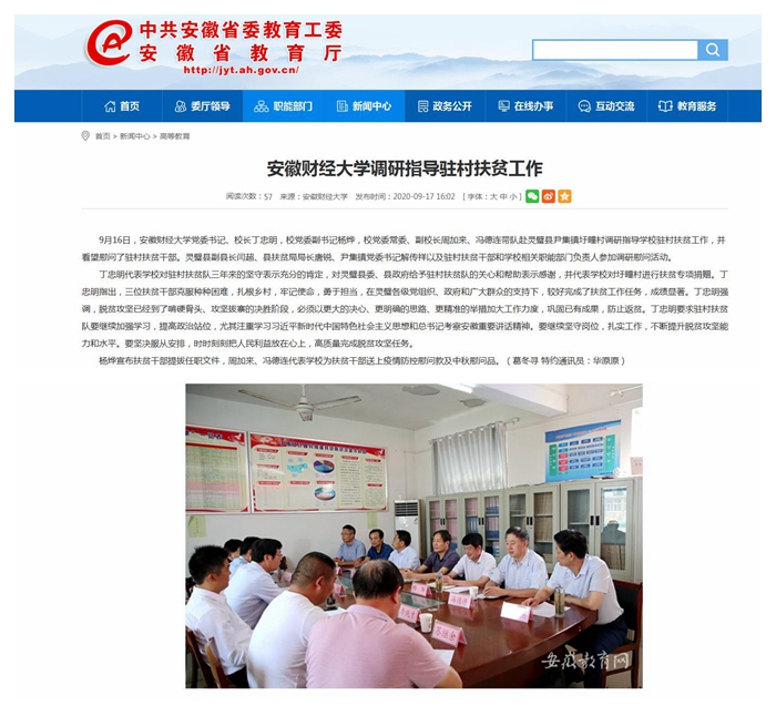 9月17日,安徽教育网、中安教育网报道了我校到扶贫帮扶点指导调研扶贫工作,具体报道链接如下: