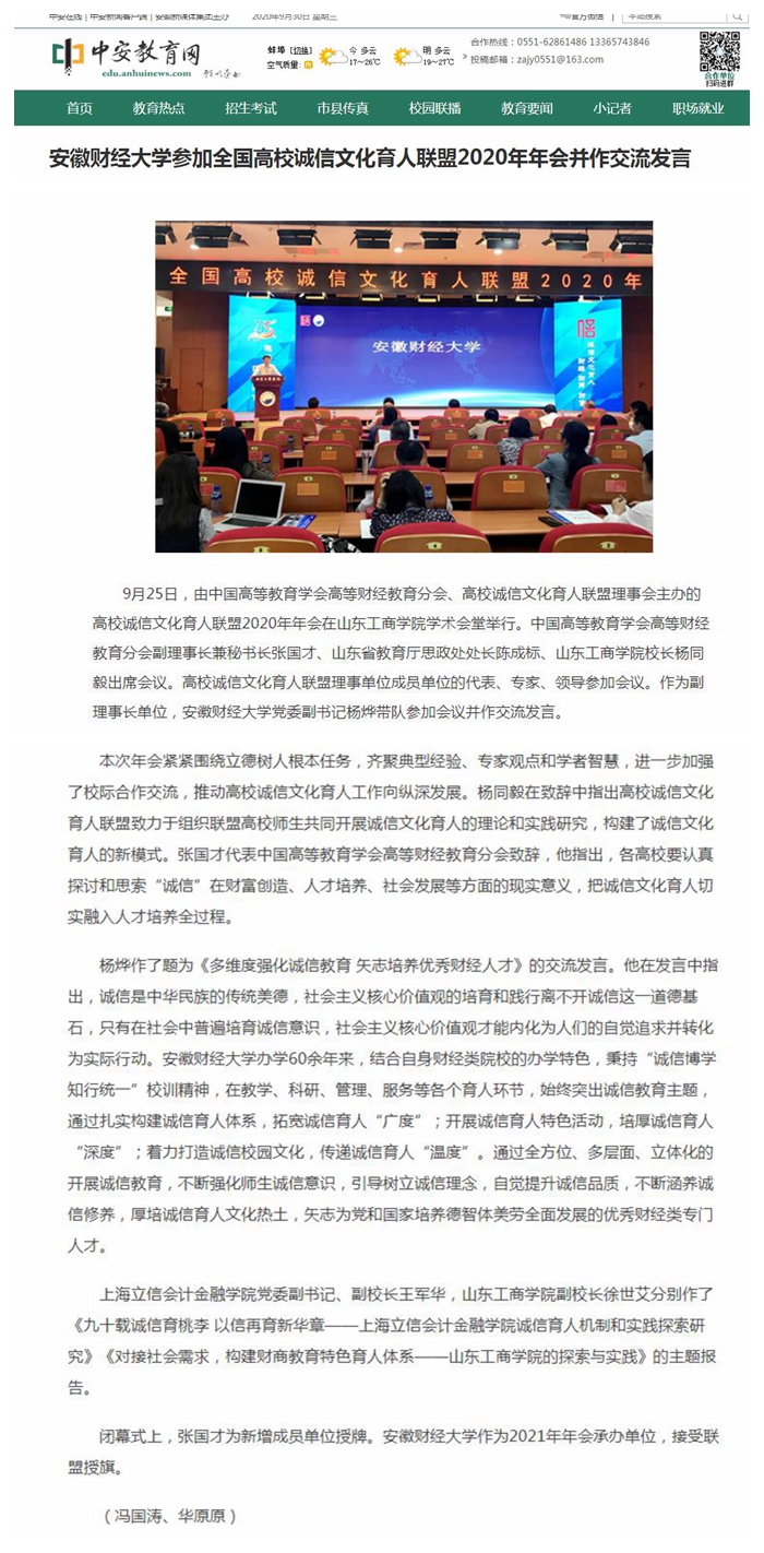 9月29日,中安教育网报道了我校参加全国高校诚信文化育人联盟2020年年会并作交流发言。具体报道链接如下: