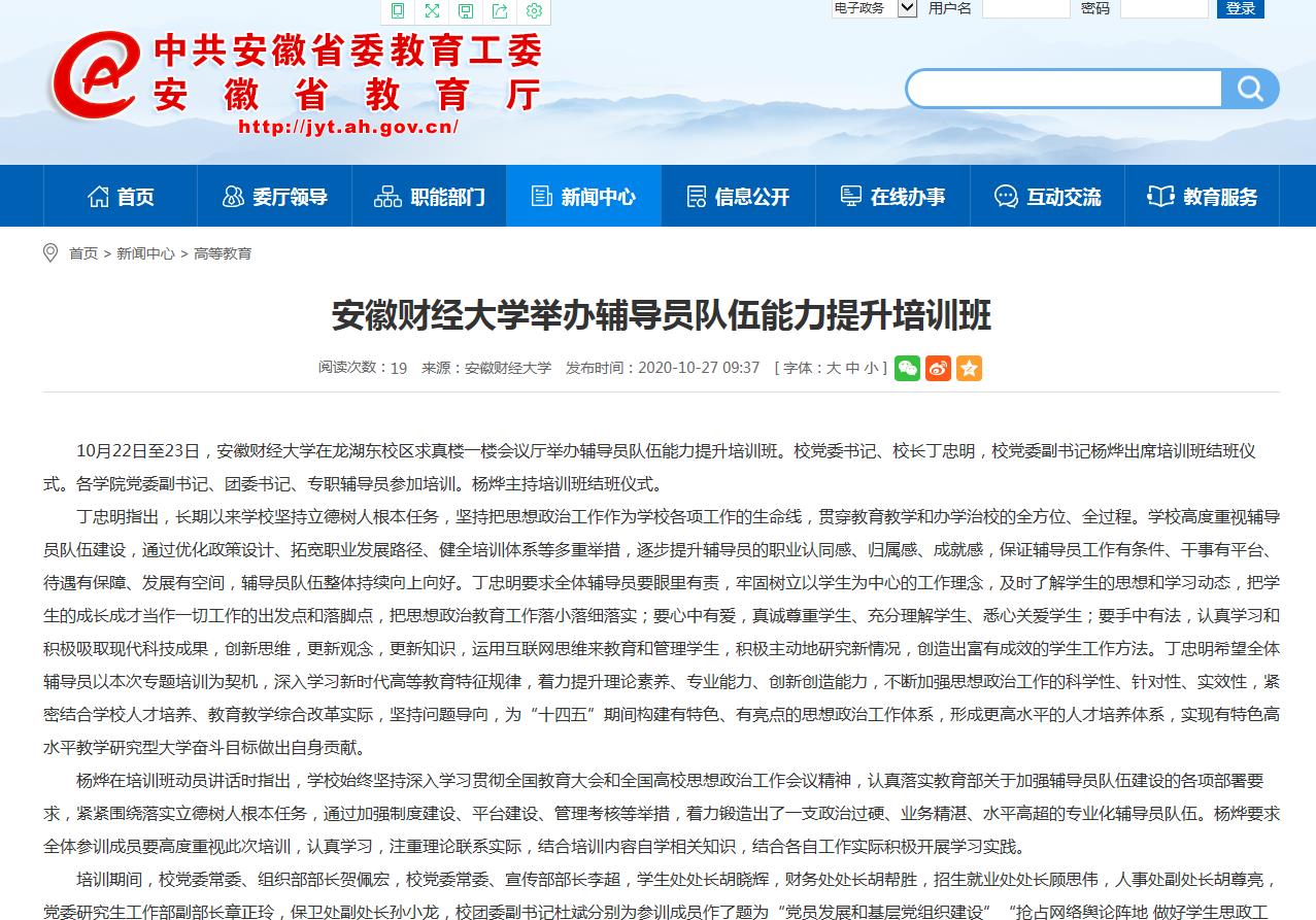 10月27日,安徽教育网、中安教育网陆续报道了我校举办辅导员队伍能力提升培训班。