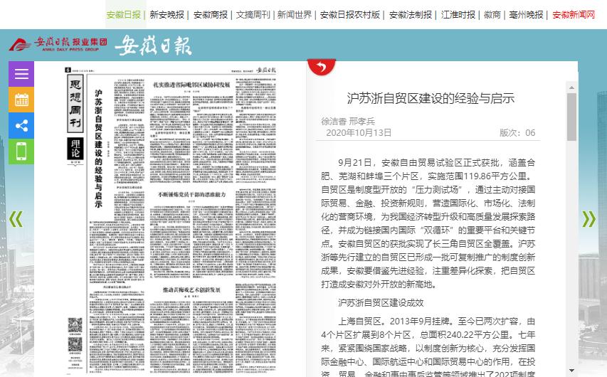 10月13日,《安徽日报》第六版思想周刊理论版报道我校徐洁香 邢孝兵理论文章《沪苏浙自贸区建设的经验与启示》。
