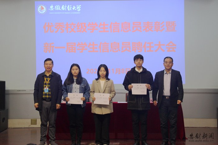 汪金龙宣读了《关于表彰梁昊等40名同学为乐竞在线注册 2019-2020学年优秀学生教学信息员的决定》《关于聘任袁春雨等384名同学为乐竞在线注册2020—2021学年学生教学信息员的通知》。经庭如、汪金龙共同为优秀学生教学信息员颁发了荣誉证书,并向新聘任的学生教学信息员代表颁发了聘书。