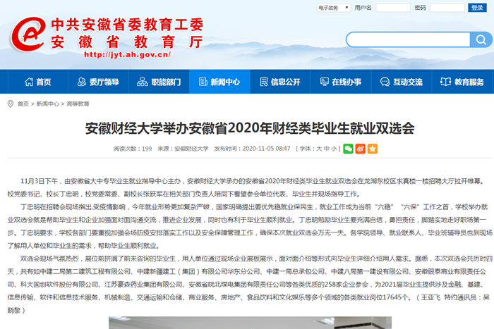 11月5日,安徽教育网报道了我校我校举办安徽省2020年财经类毕业生就业双选会。相关报道具体链接如下:http://jyt.ah.gov.cn/xwzx/gdjy/40377309.html