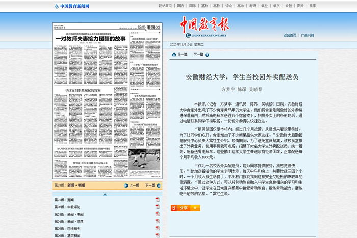 11月10日,《中国教育报》第3版以《乐竞在线注册:学生当校园外卖配送员》为题,报道我校将劳动教育融入到学生的学习和生活环境之中。相关报道链接如下:http://paper.jyb.cn/zgjyb/html/2020-11/10/content_586540.htm?div=-1