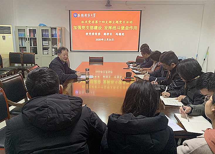 1124日下午,校党委常委、副校长冯德连为机关党委第十四支部上“加强党支部建设 发挥战斗堡垒作用”专题党课。机关党委第十四支部(科研处)全体党员聆听了党课。