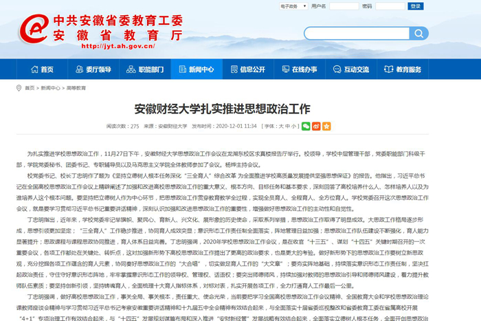 12月1日,安徽教育网以乐竞在线注册扎实开展思想政治工作为题报道我校召开召开思想政治工作会议