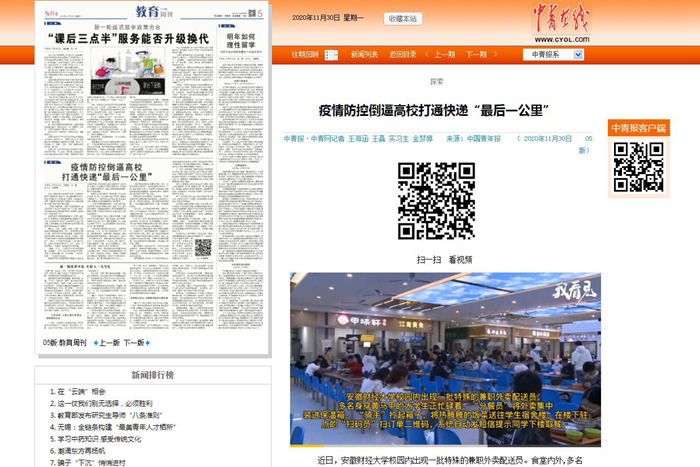 11月30日,中国教育报第五版以《疫情防控倒逼高校打通快递“最后一公里”》报道我校校园外卖配送员