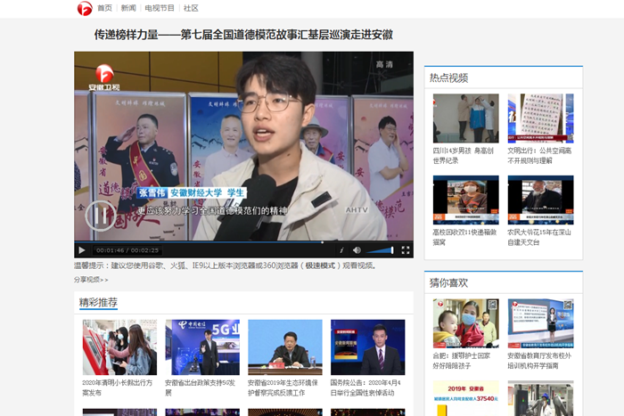 11月22日,安徽新闻联播以《传递榜样力量-第七届全国道德模范故事汇基层巡演走进安徽》为题报道我校巡演专场。