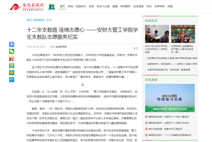 12月8日,凤凰网、安徽新闻网报道我校我校管工学院学生志愿支教队事迹。