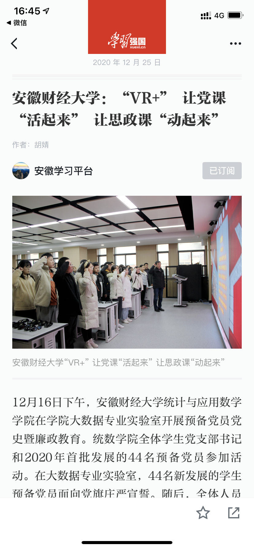 12月21日,学习强国、安徽教育网、凤凰网、安徽新闻网报道我校“VR”+ 让党课“活起来” 让思政课“动起来”