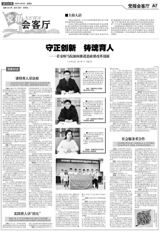 12月25日,《蚌埠日报》第07版党报会客厅以《守正创新 铸魂育人——看安财马院如何推进思政课改革创新》为题,报道了我校马院推进思政课改革创新。