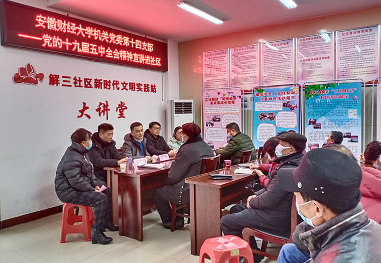 12月29日下午,机关党委第十四党支部走进解三社区宣讲党的十九届五中全会精神。机关党委委员、科研处处长方鸣,机关党委第十四党支部书记、科研处副处长李景宝,解三社区相关负责人,第十四党支部和解三社区党员代表参加活动。