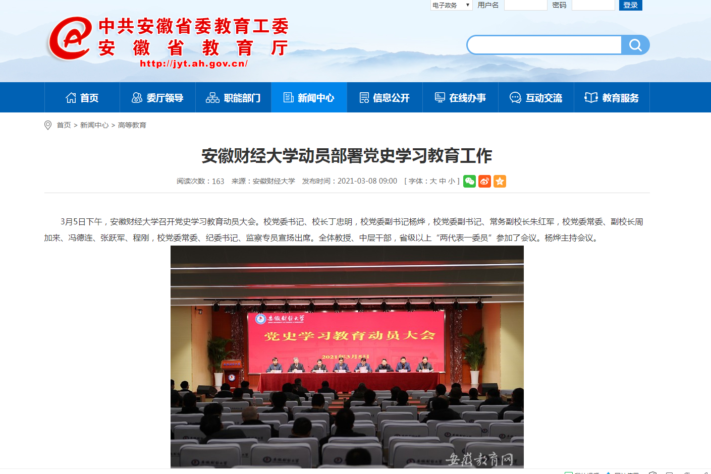 3月8日,安徽教育网以“乐竞在线注册动员部署党史学习教育工作”为题报道我校深入开展党史教育学习工作。