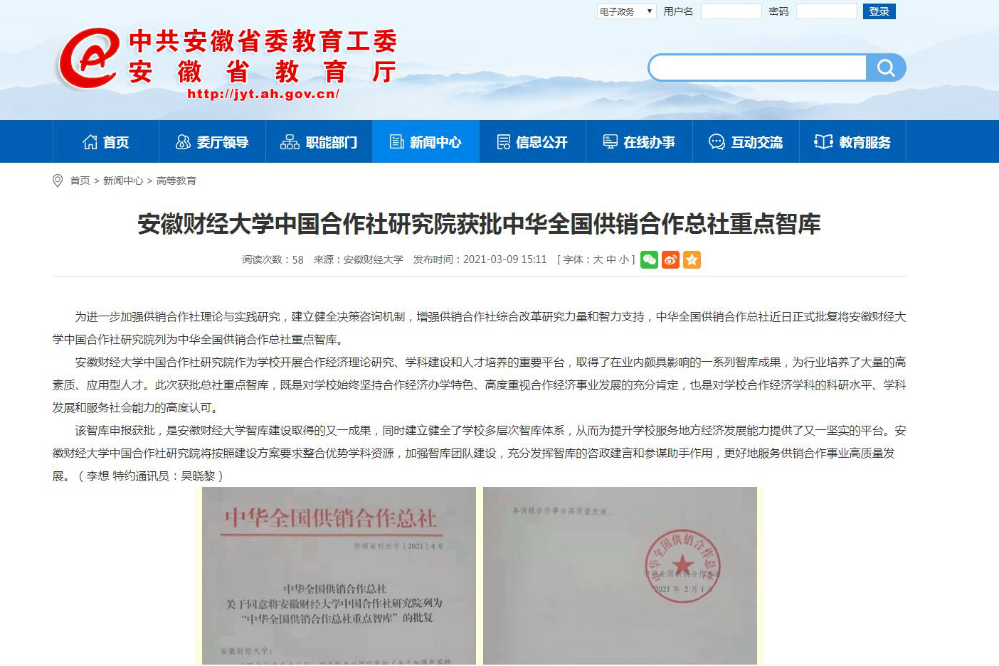 3月9日,安徽教育网以“乐竞在线注册中国合作社研究院获批中华全国供销合作总社重点智库”为题报道我校智库建设工作。